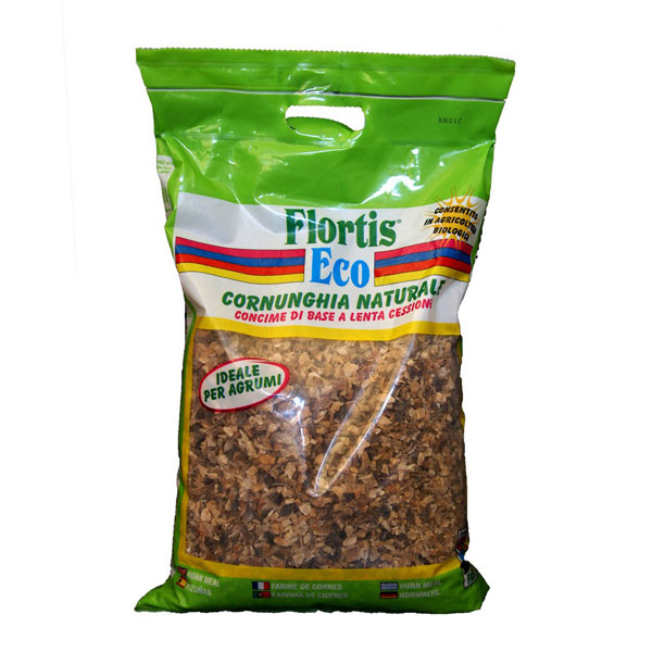 La cornunghia naturale Flortis è un concime a lunga durata ottenuto esclusivamente da residui di corna e unghie di animali allo stato naturale, è di piccole dimensioni per essere meglio assorbito dal terreno.