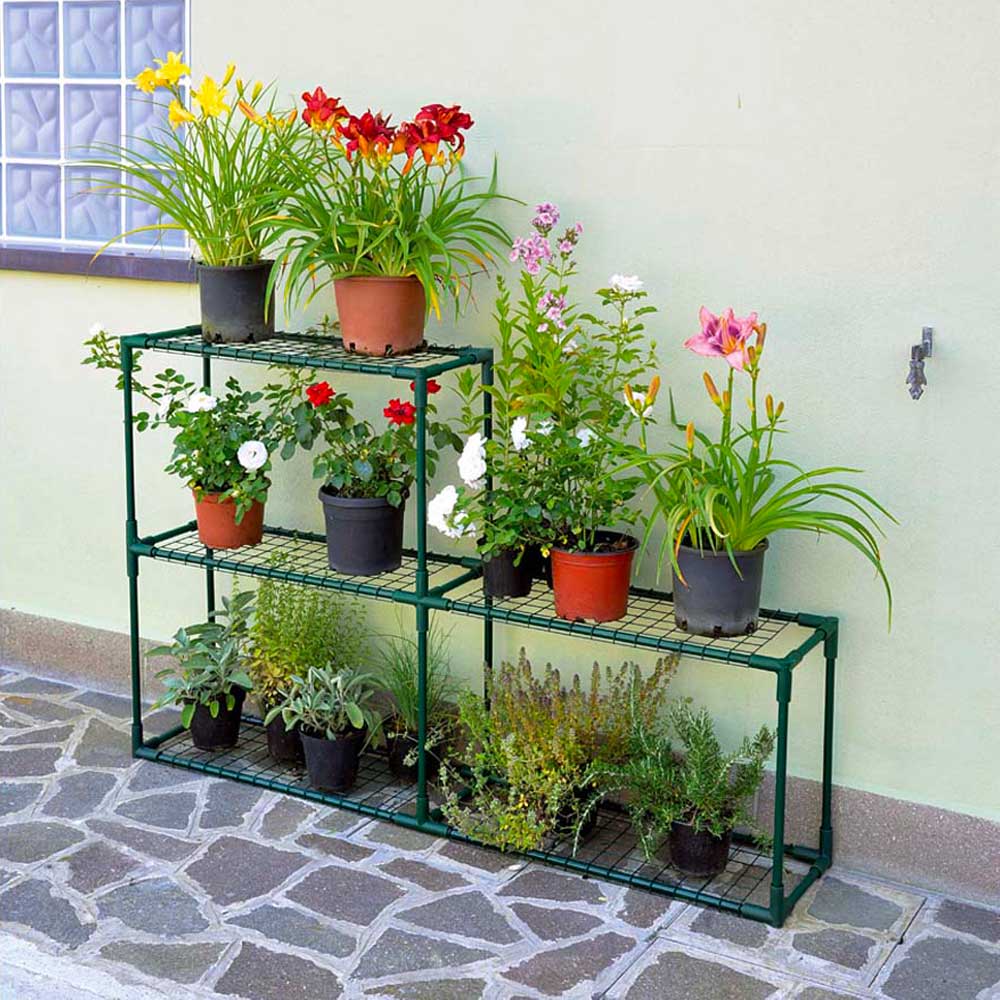 Comodo scaffale a ripiani ideale per vasi di fiori o piantine, utile per ottimizzare lo spazio su balconi e terrazzi.