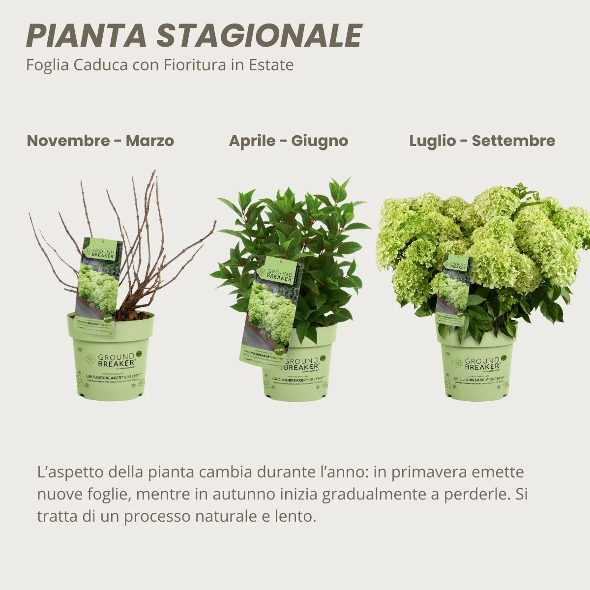 Groundbreaker® Greeny è una Hydrangea paniculata nana selezionata per il suo sviluppo prevalentemente orizzontale e la ramificazione ricca. Raggiunge circa 40 cm di altezza e 80 cm di larghezza, formando un arbusto basso, espanso e molto ornamentale. Il fogliame è deciduo, fine e ordinato, mentre le pannocchie si sviluppano sui rami dell’anno da luglio a settembre. La fioritura si apre in verde e vira gradualmente a un verde più chiaro, mantenendo a lungo un aspetto fresco e decorativo.