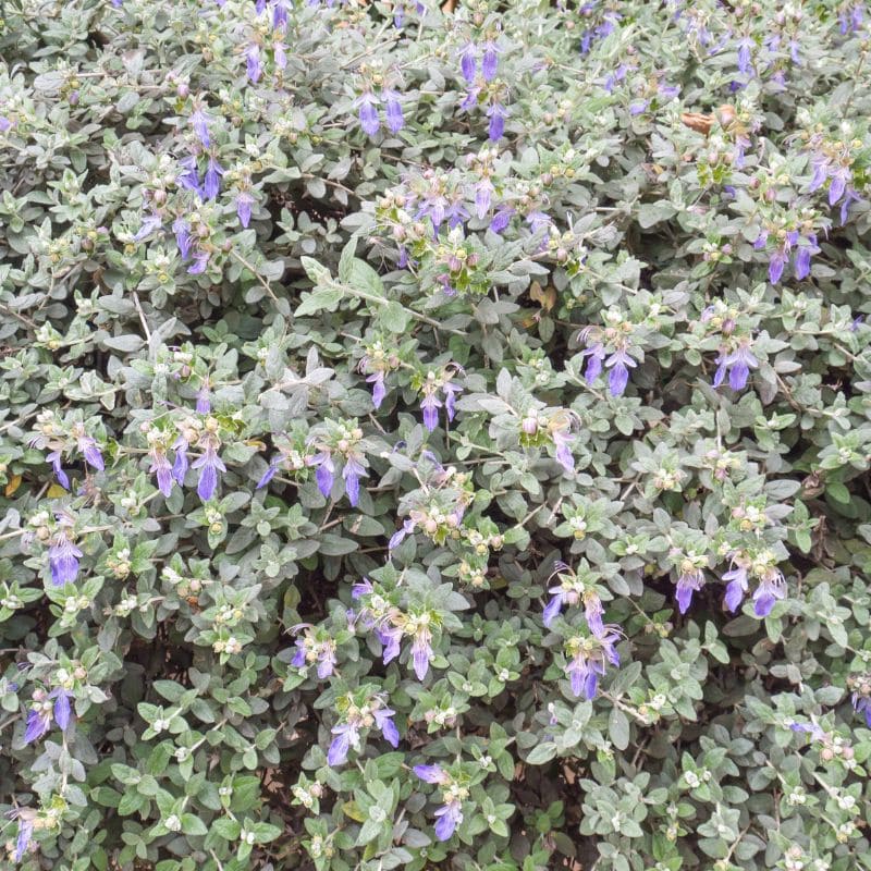 Teucrium fruticans ‘Azureum’ è un arbusto sempreverde mediterraneo a portamento eretto e leggermente espanso. Raggiunge in media 1,5–2 m di altezza e larghezza. I rami sono sottili, tomentosi, di colore grigio-argenteo. Le foglie sono piccole, opposte, verde-grigio sulla pagina superiore e argentate sotto. Il fogliame crea un effetto luminoso e leggero. I fiori, numerosi, sono azzurro intenso, labiati, molto ornamentali. Fiorisce a ondate dalla tarda primavera all’estate, con possibili riprese in autunno nei climi miti. Attira api e altri insetti utili.