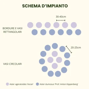 Per valorizzare al meglio il Mix Aster Autunnale compatto, le piante vanno disposte seguendo la loro altezza naturale. Gli Aster ‘Asran’ (45–70 cm) si collocano sullo sfondo di una bordura o al centro di un’aiuola o di un vaso, mentre i più compatti ‘Prof. Anton Kippenberg’ (30–45 cm) trovano posto sul fronte o lungo i bordi. In piena terra si consiglia una distanza di 30–40 cm tra le piante, per favorire aerazione e sviluppo equilibrato. In contenitore, invece, è possibile ridurre la distanza a 20–25 cm, così da ottenere un effetto più compatto e decorativo, ideale per vasi capienti o piccoli spazi urbani.