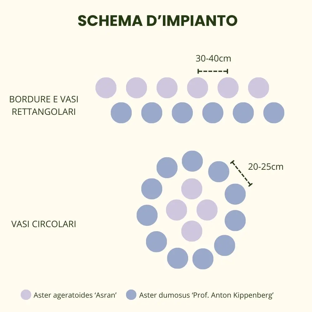 Per valorizzare al meglio il Mix Aster Autunnale compatto, le piante vanno disposte seguendo la loro altezza naturale. Gli Aster ‘Asran’ (45–70 cm) si collocano sullo sfondo di una bordura o al centro di un’aiuola o di un vaso, mentre i più compatti ‘Prof. Anton Kippenberg’ (30–45 cm) trovano posto sul fronte o lungo i bordi. In piena terra si consiglia una distanza di 30–40 cm tra le piante, per favorire aerazione e sviluppo equilibrato. In contenitore, invece, è possibile ridurre la distanza a 20–25 cm, così da ottenere un effetto più compatto e decorativo, ideale per vasi capienti o piccoli spazi urbani.