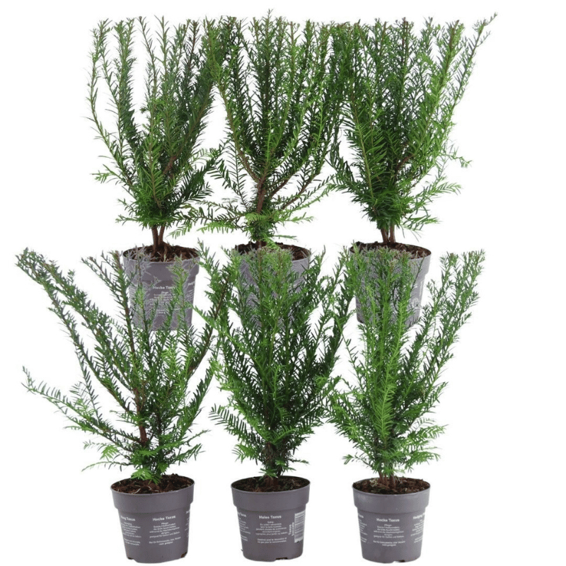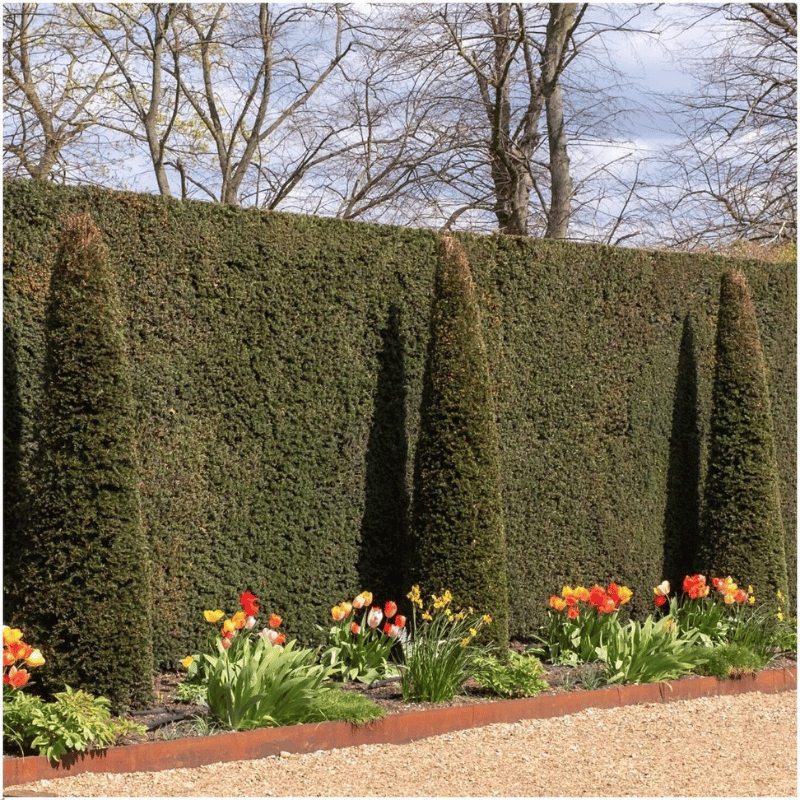 Siepe Taxus Baccata. Conifera sempreverde a crescita lenta. Portamento denso, eretto, facilmente modellabile. Foglie aghiformi appiattite, verde scuro lucido, disposte a pettine. Fiori poco appariscenti, separati su piante maschili e femminili. Sulle piante femminili compaiono arilli rossi carnosi che avvolgono il seme. Raggiunge in genere 2–4 m in siepe, oltre in piena terra e senza potature. Longevità molto elevata.