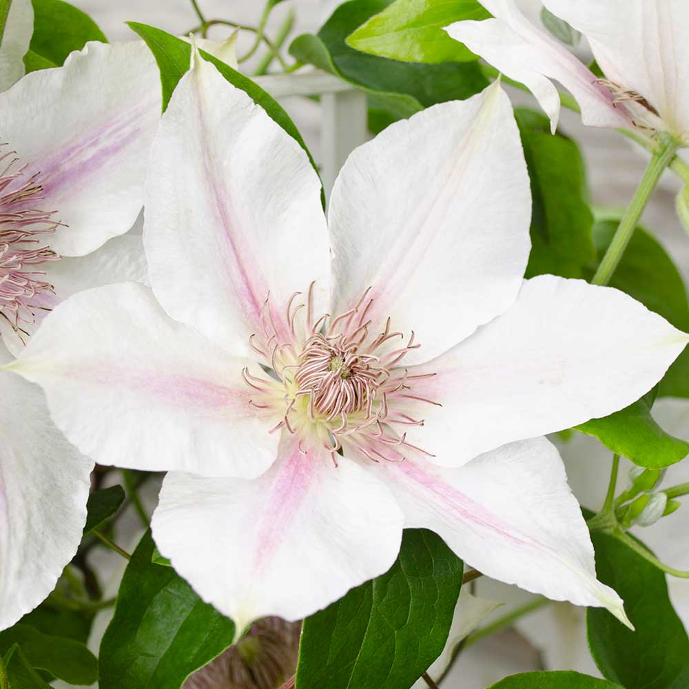 I fiori della Clematis Boulevard Corinne sono di un bianco puro con delicate sfumature di rosa. Ogni fiore è composto da sei petali sottili e delicati che si aprono a raggiera. Il centro del fiore è adornato da stami di colore giallo, che attirano farfalle e altri insetti benefici.