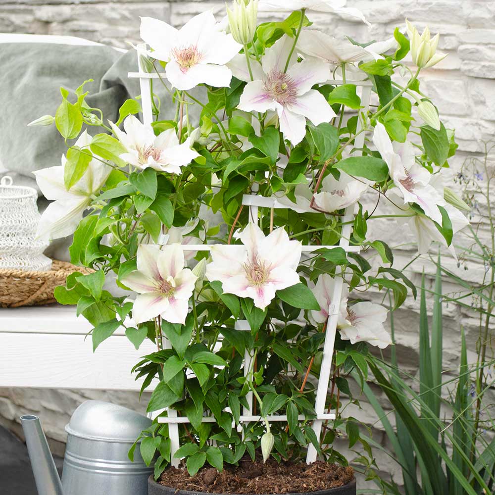 La Clematis Boulevard Corinne fiorisce tra maggio e settembre, regalando uno spettacolo di fiori bianchi con sfumature di rosa che contrastano con il verde delle sue foglie. Questa pianta è perfetta per dare un tocco di eleganza e dolcezza al tuo giardino durante i mesi primaverili ed estivi.